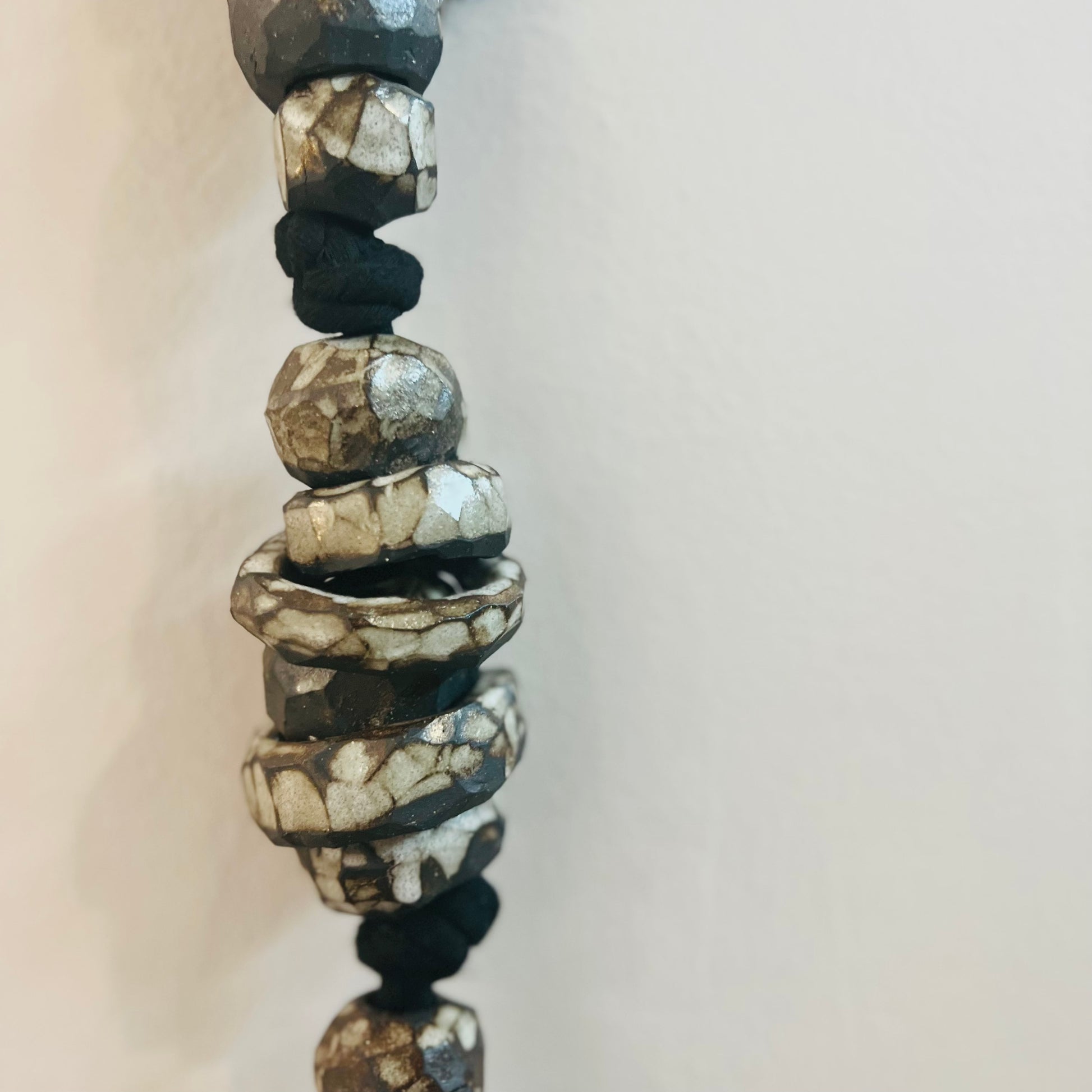 These hand carved and glazed ceramic beads offer an excellent opportunity to enhance your home decor with a touch of uniqueness and style. Strung on a sturdy 34-inch black Turkish cotton rope, these beads are perfect for hanging and displaying in any room. Each bead is meticulously crafted and showcases intricate carved details and beautiful glazing, resulting in a rustic yet refined aesthetic. The addition of the natural cotton rope brings a warm and inviting feel to the overall design, making it a versatile choice for any interior style. Whether used as a wall hanging or a decorative accent, these ceramic bead ropes will infuse your home with character and charm.
