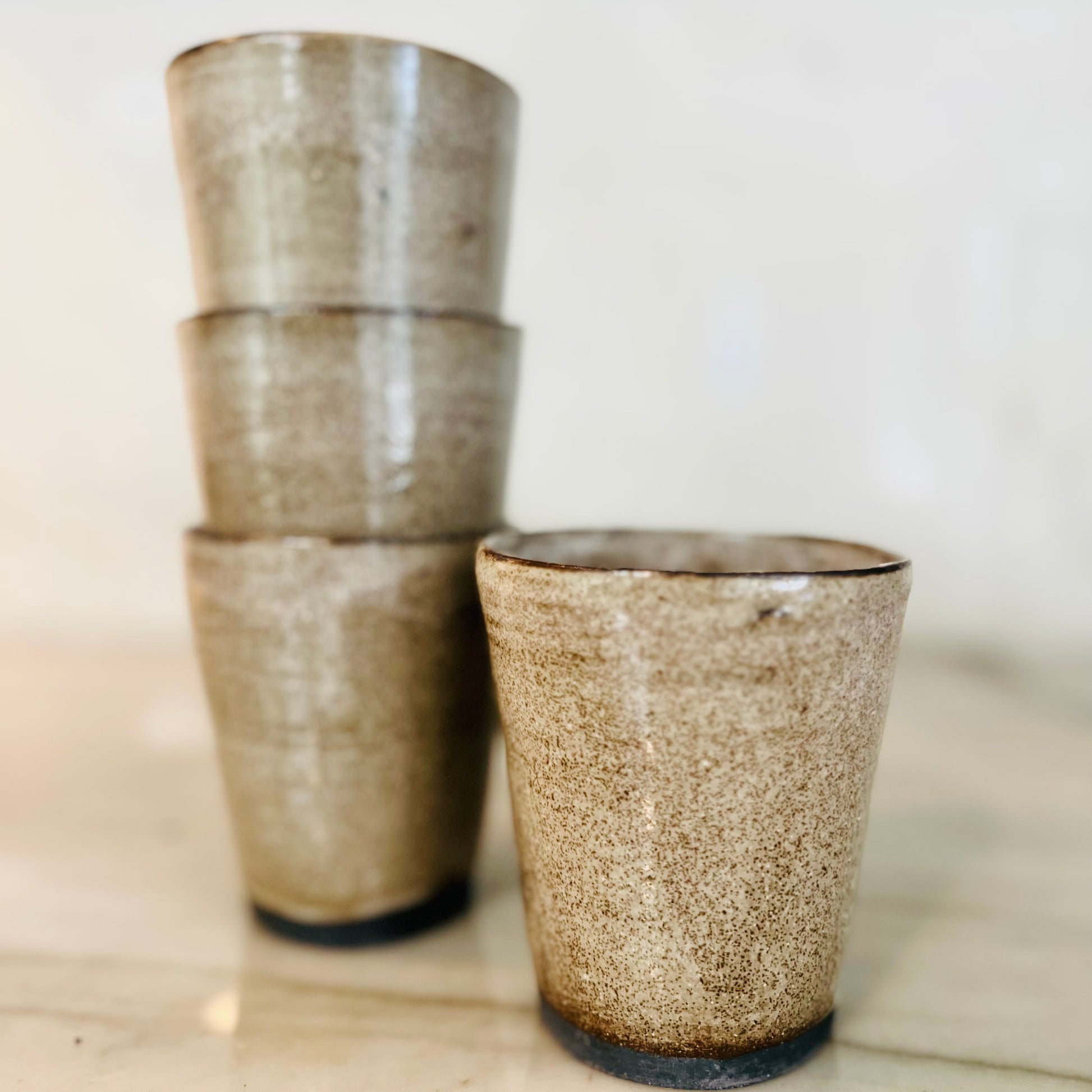 The set of four tumblers features a beautiful oatmeal glaze, creating a warm and inviting aesthetic. Crafted from high-quality B3 clay body, these tumblers measure at 4 inches tall by 3 inches wide. Perfect for enjoying your favorite beverages, they add a touch of elegance to any table setting.